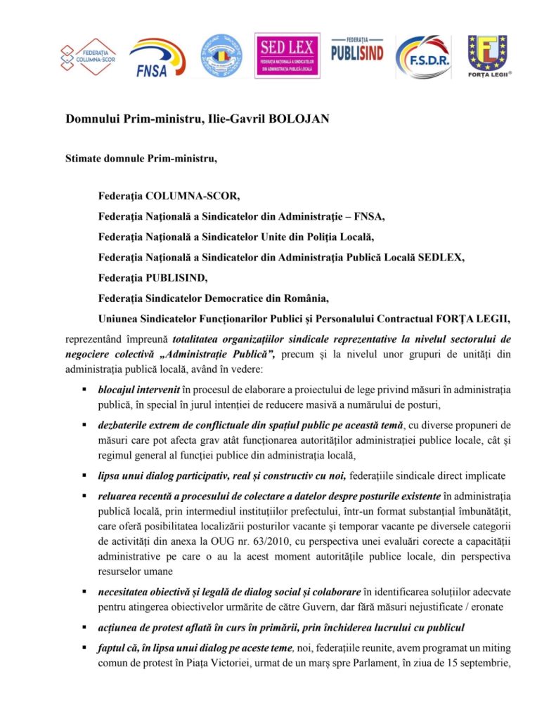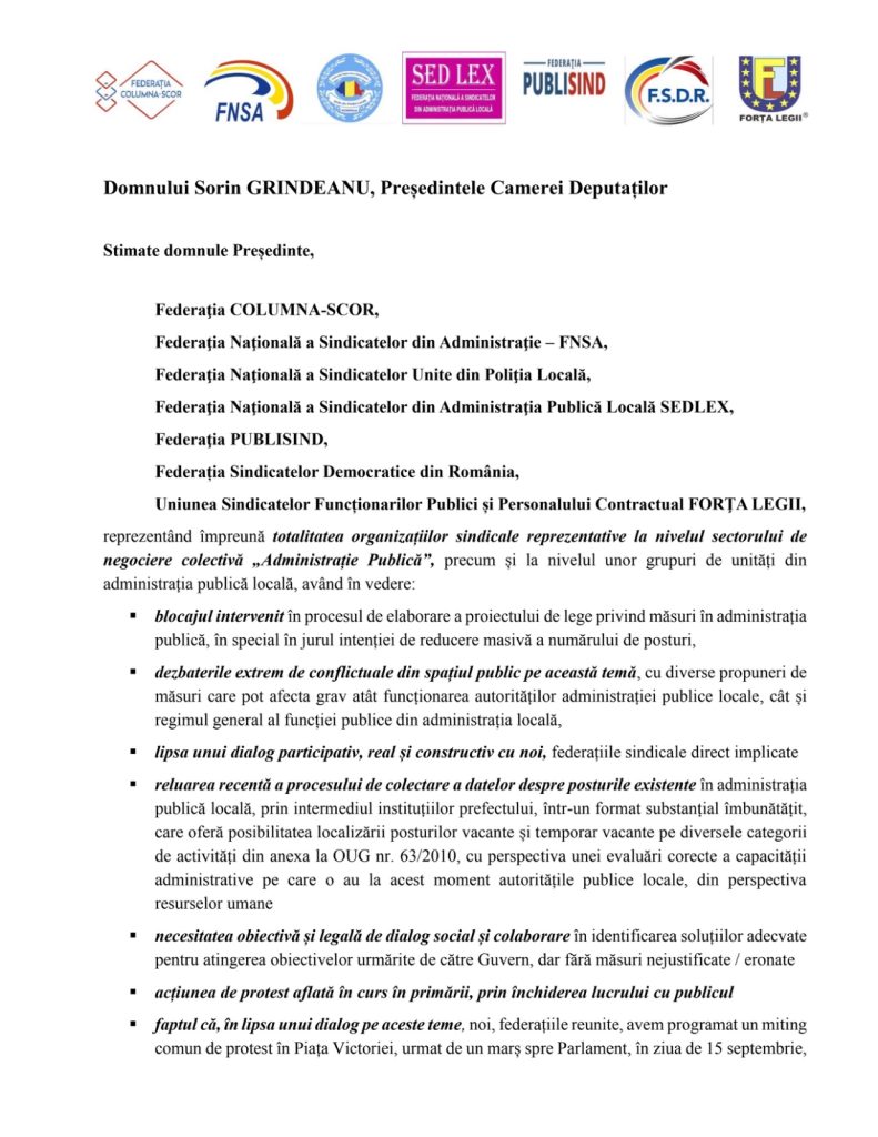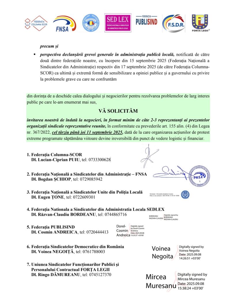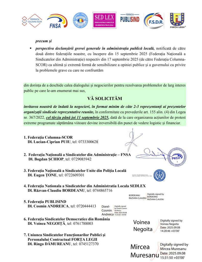 Federațiile bugetare, care urmează să participe la acțiunea masivă de protest de luni, 15 septembrie 2025, au lansat Guvernului și Președintelui Camerei Deputaților, o ultimă invitație la dialog.