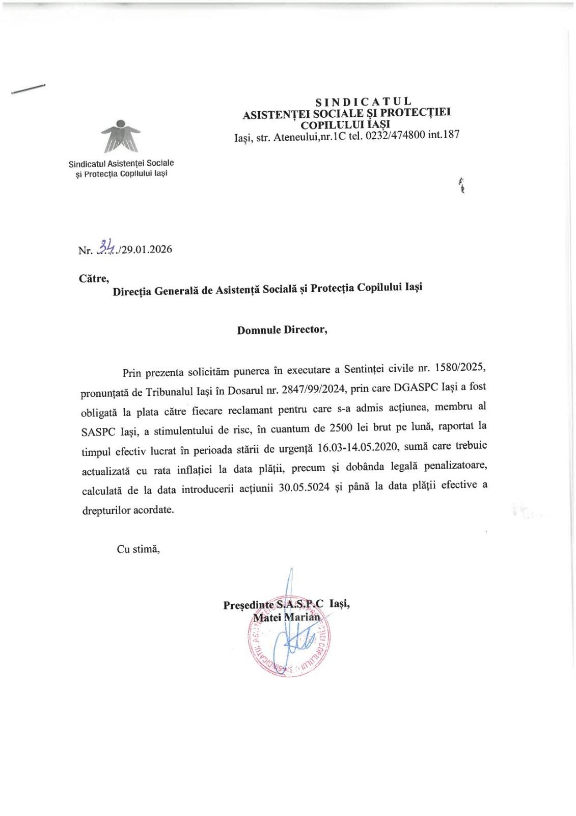 Actualizare 3: În cursul zilei de astăzi, 29.01.2026, conducerea sindicatului a înaintat o adresă pentru punerea în plată a dosarului nr. 2847/99/2024, având ca obiect obligarea DGASPC Iași la plata stimulentului de risc, în cuantum de 2.500 lei brut/lună, raportat la timpul efectiv lucrat.